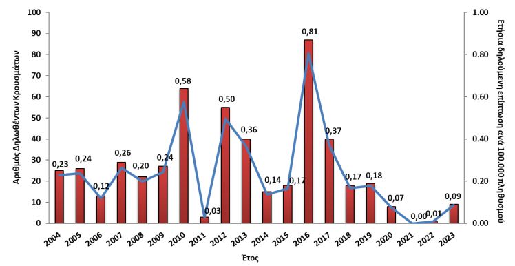 Ωστόσο, ο ΕΟΔΥ επισημαίνει ότι υπάρχει σημαντική υποδιάγνωση και υποδήλωση του νοσήματος, οπότε τα περιστατικά μπορεί να είναι πολύ περισσότερα.