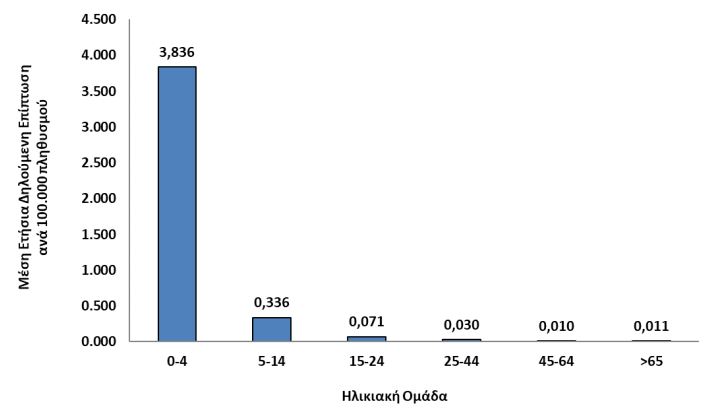 Από τα 519 κρούσματα που καταγράφηκαν συνολικά σε αυτό το διάστημα, τα 396 εντοπίστηκαν στις ηλικίες 0-4 ετών (3,86 κρούσματα ανά 100.000 πληθυσμού) κι από αυτά, τα 333 κρούσματα ήταν μικρότερα του ενός έτους .