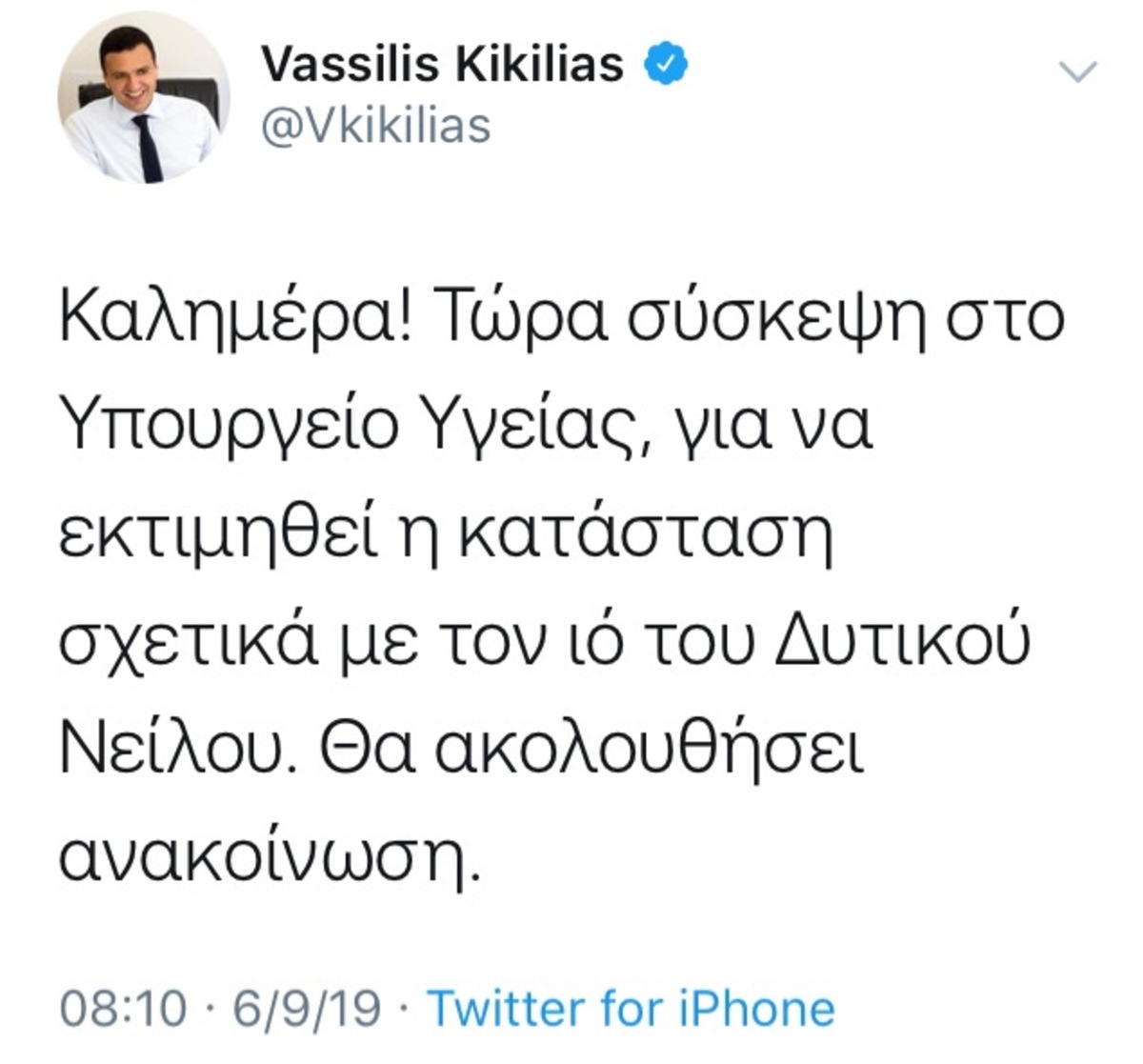 Ο Υπουργός Υγείας Βασίλης Κικίλιας συγκαλεί σύσκεψη στο Υπουργείο Υγείας για την αποτελεσματικότερη αντιμετώπιση των κρουσμάτων του Ιού του Δυτικού Νείλου, καθώς οι υγειονομικές αρχές έχουν θορυβηθεί από την τελευταία πανευρωπαϊκή καταγραφή, που μας κατατάσσει στις χώρες με περισσότερα κρούσματα στην Ευρώπη.