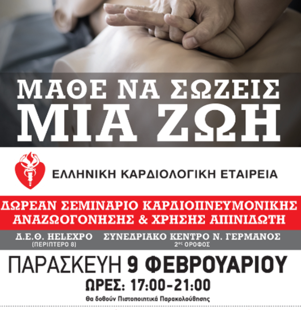 Με την πεποίθηση ότι αποτελεί προτεραιότητα η εκπαίδευση και η ενημέρωση των πολιτών αλλά και η ευαισθητοποίησή τους σε κρίσιμα θέματα υγείας, διοργανώνει την Παρασκευή 9 Φεβρουαρίου 2018 στο Συνεδριακό Κέντρο Ν. Γερμανός (Περίπτερο 8, 2Ος όροφος) στους χώρους της ΔΕΘ, δωρεάν σεμινάριο στην Καρδιοπνευμονική Αναζωογόνηση και τη χρήση εξωτερικού απινιδωτή.