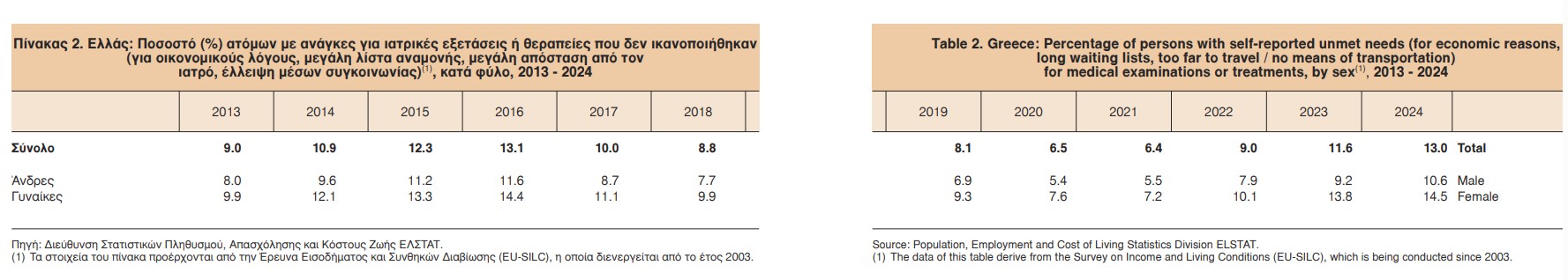 Το 2024, το 13,6% του πληθυσμού δήλωσε ότι είχε ανάγκη για ιατρικές εξετάσεις ή θεραπείες, τις οποίες το σύστημα υγείας δεν ικανοποίησε. Οι κυριότεροι λόγοι είναι οι εξής: