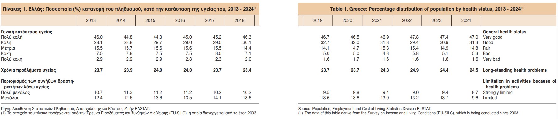 Παρόλα αυτά, το 24,5% του πληθυσμού παραδέχεται ότι αντιμετωπίζει κάποιο χρόνιο πρόβλημα υγείας, ποσοστό που παραμένει σταθερά υψηλό την τελευταία δεκαετία.