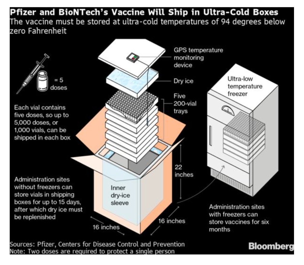 Η Pfizer έχει αναπτύξει έναν υπερσύγχρονο μηχανισμό, ως δικλείδα ασφαλείας για τη σωστή χορήγηση των εμβολίων της. Συγκεκριμένα, έχει κατασκευάσει μία ειδική ηλεκτρονική συσκευή που τοποθετείται μέσα σε κάθε κιβώτιο. Αποτελείται από ένα GPS και έναν θερμοανιχνευτή, για την παρακολούθηση της θερμοκρασία των εμβολίων, εντός της συσκευασίας.