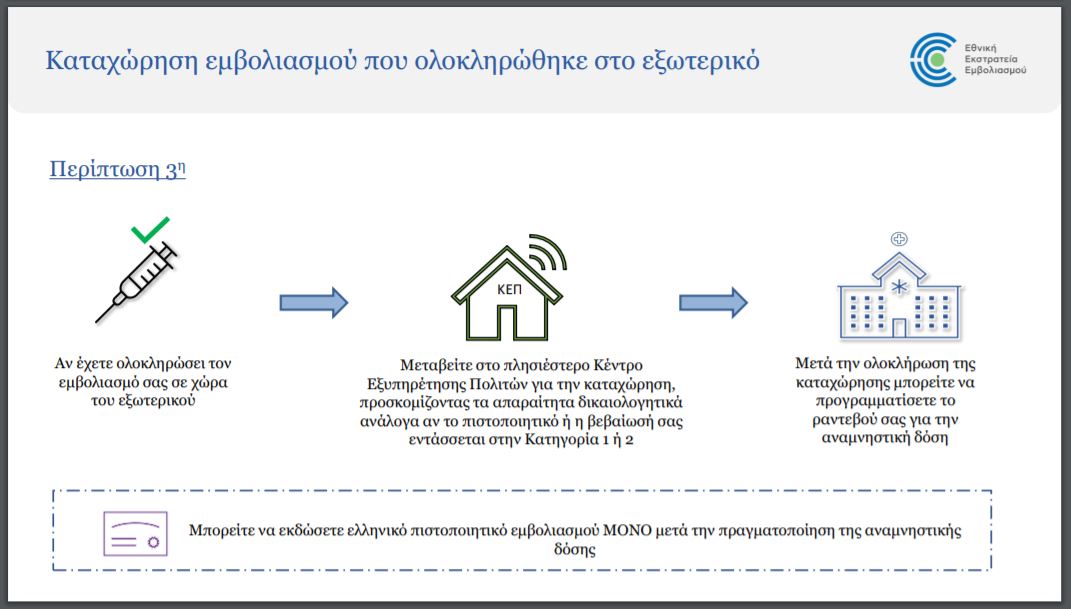 Σύμφωνα με την ΚΥΑ, Έλληνες πολίτες, πολίτες κράτους – μέλους της Ε.Ε. ή υπήκοοι τρίτων χωρών, οι οποίοι έχουν πραγματοποιήσει τις δύο δόσεις εμβολιασμού κατά του κορωνοϊού COVID-19, ή, εφόσον πρόκειται για μονοδοσικό εμβόλιο, τη μοναδική δόση, σε οποιοδήποτε άλλο κράτος πλην της Ελλάδας, δύνανται να προσέρχονται στα Κ.Ε.Π. για να υποβάλουν αίτηση προγραμματισμού της αναμνηστικής δόσης εμβολιασμού σε εμβολιαστικό κέντρο της χώρας αφότου προηγουμένως καταχωριστούν στα Μητρώα εμβολιασμένων εξωτερικού κατά του κορωνοϊού COVID-19.