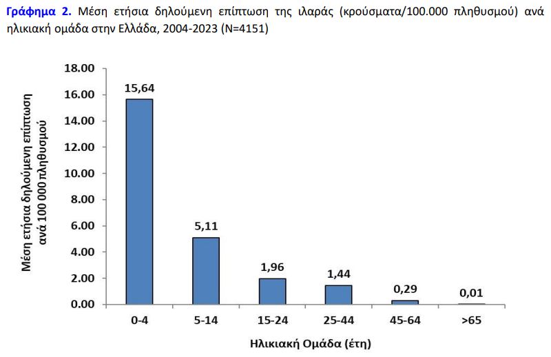 Κατά τα έτη 2021, 2022 και 2023 δε δηλώθηκε κανένα κρούσμα ιλαράς. Επισημαίνεται η πιθανότητα υποδήλωσης λόγω της πανδημίας COVID-19. Συνολικά, η μέση ετήσια δηλούμενη επίπτωση για την περίοδο 2004-2023 στο σύνολο της χώρας ήταν 1,92/100.000 πληθυσμού (μέση τιμή αριθμού κρουσμάτων κατ’ έτος: 207,6 , συνολικός αριθμός κρουσμάτων: 4.151).