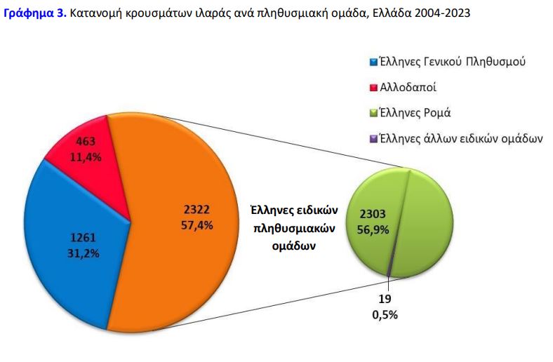 Από το σύνολο των δηλωθέντων κρουσμάτων για την περίοδο 2004-2023, η εθνικότητα ήταν γνωστή για 4.046 (97,5%). Από αυτά (Γράφημα 3):