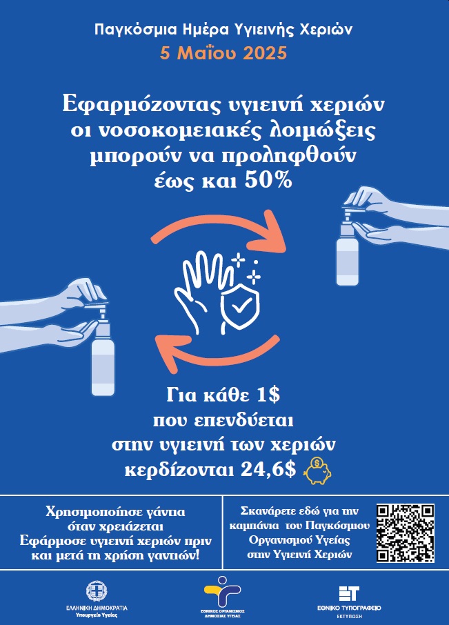Με δεδομένη τη σημασία της Υγιεινής των Χεριών στην Πρόληψη και τον Έλεγχο των Λοιμώξεων, ο Παγκόσμιος Οργανισμός Υγείας (ΠΟΥ) έχει καθιερώσει από το 2008 την 5η Μαΐου ως Παγκόσμια Ημέρα της Υγιεινής Χεριών. Ο Eθνικός Οργανισμός Δημόσιας Υγείας (ΕΟΔΥ) συμμετέχει στον εορτασμό της Παγκόσμιας Ημέρας της Υγιεινής Χεριών με την προετοιμασία και διάθεση ενημερωτικού υλικού.