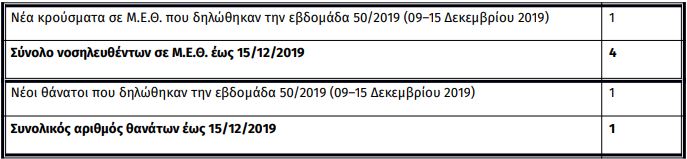 «Από 9 έως 15 Δεκεμβρίου 2019, στην Ελλάδα έχει καταγραφεί ένας θάνατος από εργαστηριακά επιβεβαιωμένη γρίπη, με νοσηλεία σε Μ.Ε.Θ. Πρόκειται για έναν άνδρα, ηλικίας 61 ετων. Από το συγκεκριμένο κρούσμα απομονώθηκε ιός γρίπης τύπου Β. Το κρούσμα δεν είχε εμβολιαστεί για την εποχική γρίπη αν και ανήκε σε ομάδα υψηλού κινδύνου για την οποία συστήνεται εμβολιασμός σύμφωνα με την σχετική εγκύκλιο του Υπουργείου Υγείας».