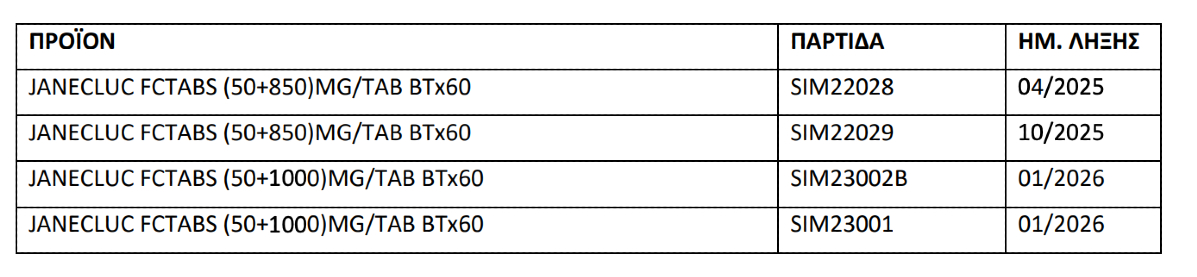 Πρόκειται για το φαρμακευτικό σκεύασμα JANECLUC FCTABS (50+850)MG/TAB BTx60 και JANECLUC FCTABS (50+1000)MG/TAB BTx60.