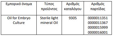 Την ανάκληση παρτίδων των ιατροτεχνολογικών προϊόντων του παρακάτω πίνακα μετά από ενημέρωση της κατασκευάστριας εταιρείας FUJIFILM Irvine Scientific Inc καθώς ανιχνεύτηκε τοξικότητα του λαδιού της καλλιέργειας που μπορεί να προκαλέσει βλάβη στην ανάπτυξη του εμβρύου και ανεπαρκή ανάπτυξη βλαστοκύστης ή μη μεταβιβάσιμη βλαστοκύστη με αποτέλεσμα στην αδυναμία διενέργειας της διαδικασίας με το εξασθενημένο έμβρυο.