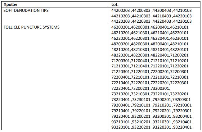 Την ανάκληση των παρτίδων του παραπάνω πίνακα των ιατροτεχνολογικών προϊόντων Κατηγορίας MDD Class IIa, SOFT DENUDATION TIPS + FOLLICLE PUNCTURE SYSTEMS λόγω του ότι κατά την διάρκεια της αξιολόγησης του κινδύνου, η ασφάλεια των προϊόντων δεν μπορεί να επιβεβαιωθεί αποδεδειγμένα, ιδίως όσον αφορά την εμβρυοτοξικότητα.
