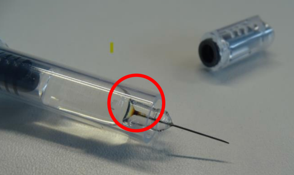 - Εάν η βάση της βελόνας στην προγεμισμένη σύριγγα εμφανίζει αποχρωματισμό (όπως απεικονίζεται στην παρακάτω εικόνα), μην διαθέσετε ή μην χορηγήσετε το Arixtra· αντ’ αυτού, επιστρέψτε το στον διανομέα φαρμακευτικών προϊόντων και/ή στη Viatris για αντικατάσταση.