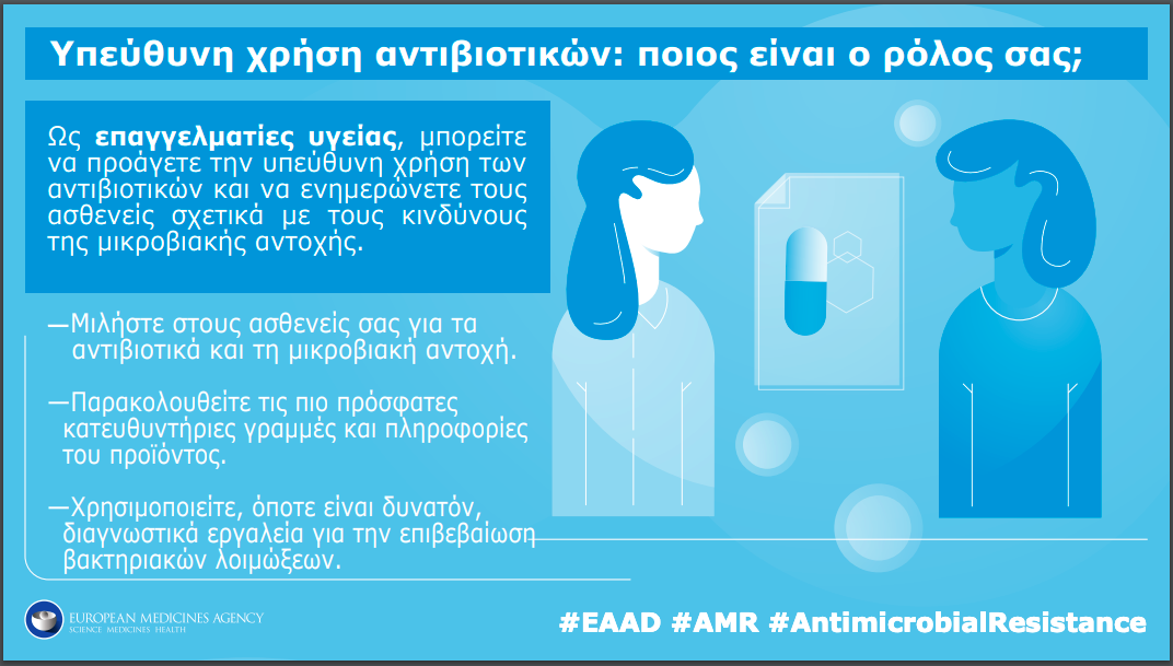 Οι επαγγελματίες Υγείας πρέπει να προάγουν την υπεύθυνη χρήση των αντιβιοτικών και να ενημερώνουν τους ασθενείς σχετικά με τους κινδύνους της μικροβιακής αντοχής.