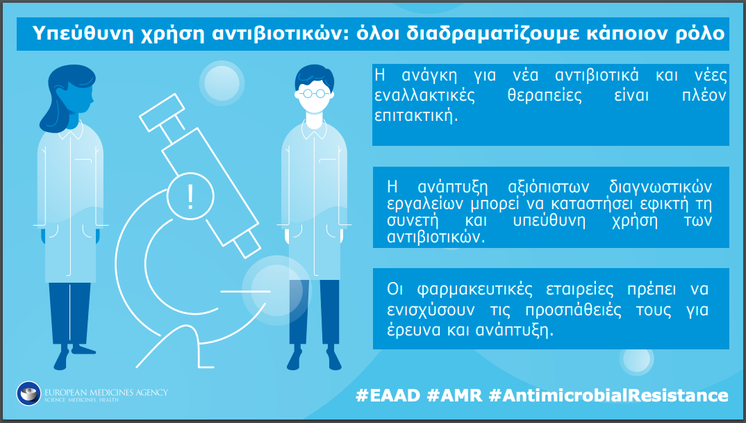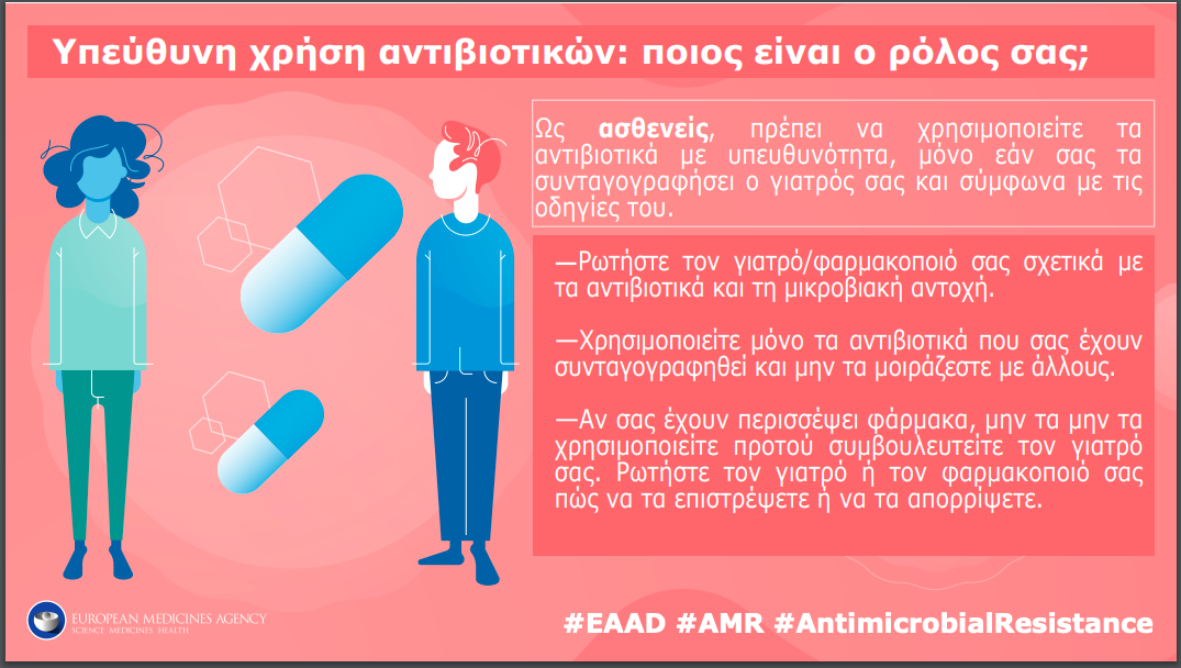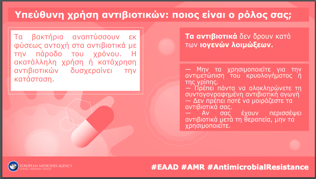 Στο πλαίσιο της Παγκόσμιας Εβδομάδας Ευαισθητοποίησης για την Ορθολογική Χρήση των Αντιβιοτικών που διανύουμε (18-24 Νοεμβρίου), ο Εθνικός Οργανισμός Φαρμάκων (ΕΟΦ) συμμετέχει στην ενημερωτική εκστρατεία του Ευρωπαϊκού Οργανισμού Φαρμάκων (EMA) για την ορθολογική χρήση των αντιβιοτικών στην Ευρώπη. Ο στόχος είναι η ευαισθητοποίηση της κοινής γνώμης για το αυξανόμενο πρόβλημα της μικροβιακής αντοχής.