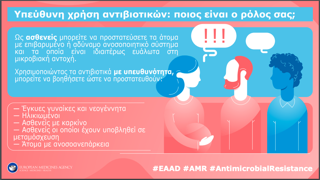 Πιο συγκεκριμένα, σύμφωνα με τον ΕΟΦ: «Ως ασθενείς μπορείτε να προστατεύσετε τα άτομα με επιβαρυμένο ή αδύναμο ανοσοποιητικό σύστημα και τα οποία είναι ιδιαιτέρως ευάλωτα στη μικροβιακή αντοχή. Χρησιμοποιώντας τα αντιβιοτικά με υπευθυνότητα, μπορείτε να βοηθήσετε ώστε να προστατευθούν: