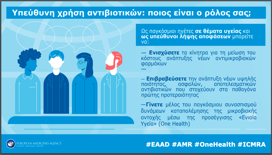 Δείτε τις επίσημες οδηγίες του ΕΟΦ και του ΕΜΑ για τη σωστή χρήση των αντιβιοτικών, εάν είστε επαγγελματίας υγείας, ασθενής, γιατρός ή εάν λαμβάνετε πολιτικές αποφάσεις για θέματα Υγείας του παγκόσμιου πληθυσμού.