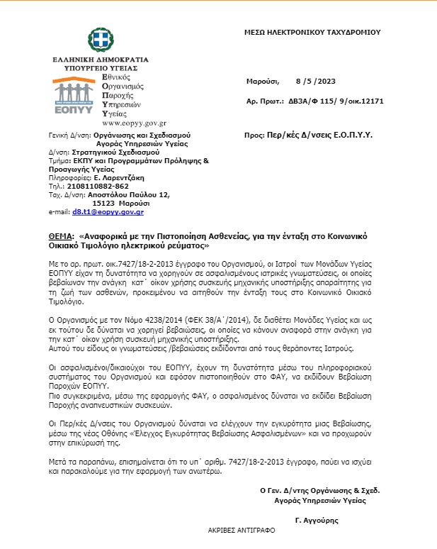 ΕΟΠΥΥ: Πώς πιστοποιείται η ασθένεια για ένταξη στο οικιακό κοινωνικό τιμολόγιο (εγκύκλιος)