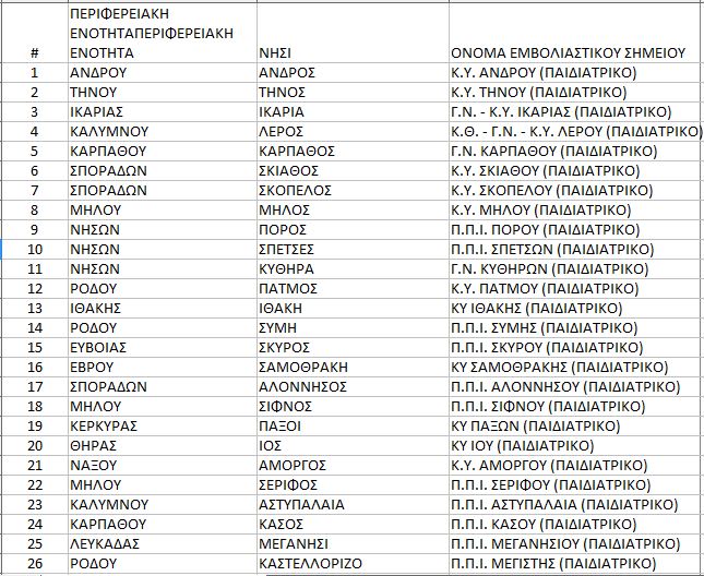 Δείτε στον πίνακα ποιες είναι δομές ΠΦΥ των νησιών, όπου θα πραγματοποιηθούν οι εμβολιασμοί των παιδιών