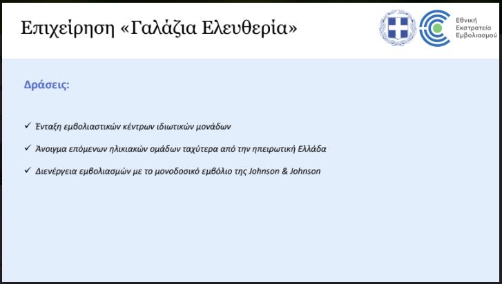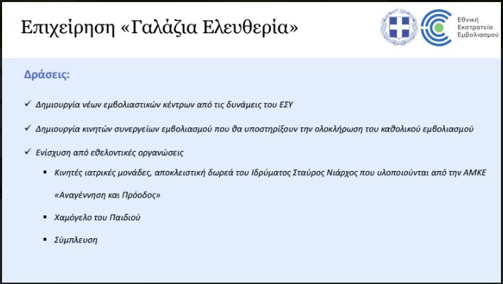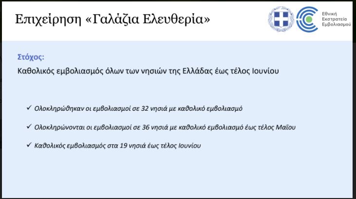 Ήδη έχουν ολοκληρωθεί οι εμβολιασμοί σε 32 νησιά και σε άλλα 36 ολοκληρώνονται έως τέλος Μαΐου. Η επιχείρηση θα ενισχυθεί από εθελοντικές οργανώσεις και κινητές ιατρικές μονάδες, αποκλειστική δωρεά του Ιδρύματος Σταύρος Νιάρχος που υλοποιούνται από την ΑΜΚΕ «Αναγέννηση και Πρόοδος», το «Χαμόγελο του Παιδιού» και τη «Σύμπλευση». Επίσης προβλέπεται η ένταξη εμβολιαστικών κέντρων ιδιωτικών μονάδων.