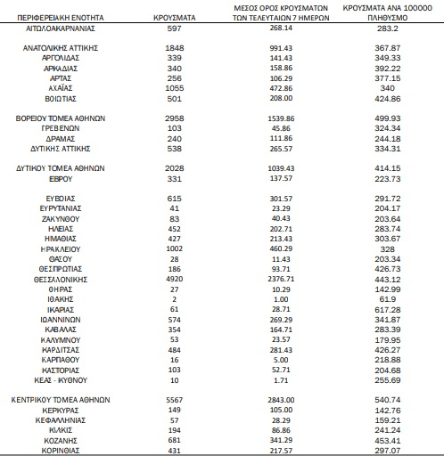 Ο ΕΟΔΥ ανακοίνωσε 40.560 νέες μολύνσεις, εκ των οποίων 32 εντοπίστηκαν κατόπιν ελέγχων στις πύλες εισόδου της χώρας. 17.000 εντοπίστηκαν στην Αττική, 4.920 στη Θεσσαλονίκη, ενώ τετραψήφιο αριθμό κρουσμάτων κατέγραψαν επίσης η Αχαΐα, η Λάρισα και το Ηράκλειο Κρήτης. Η ανησυχία παραμένει για τις Περιφερειακές Ενότητες Θεσσαλίας και Κρήτης, που συγκέντρωσαν 2.435 και 1.870 νέες μολύνσεις, αντίστοιχα.