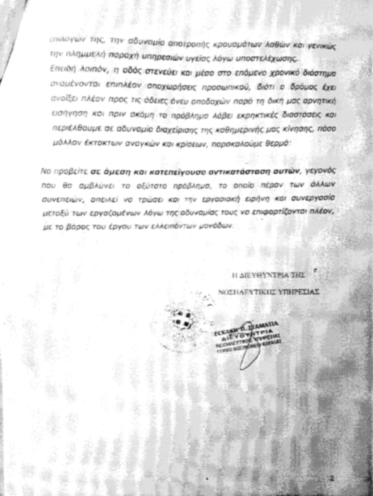 «Η Διεύθυνσή μας προσπαθώντας καθημερινά να ελέγχει, καταγράφει, αξιολογεί και ιεραρχεί τις παρουσιαζόμενες ανάγκες, αντιμετωπίζει σχεδόν ανυπέρβλητες δυσχέρειες, διότι πέρα από τις αποχωρήσεις λόγω συνταξιοδότησης, υπάρχουν και ελλείψεις λόγω αυξημένων απουσιών (αναρρωτικές άδειες, άδειες αναπηρίας, μετατάξεις, μετακινήσεις κ.α.) με αποτέλεσμα τον συνεχή περιορισμό του φάσματος των εναλλακτικών επιλογών της, την αδυναμία αποφυγής κρουσμάτων λαθών και γενικώς την πλημμελή παροχή υπηρεσιών υγείας, λόγω υποστελέχωσης»