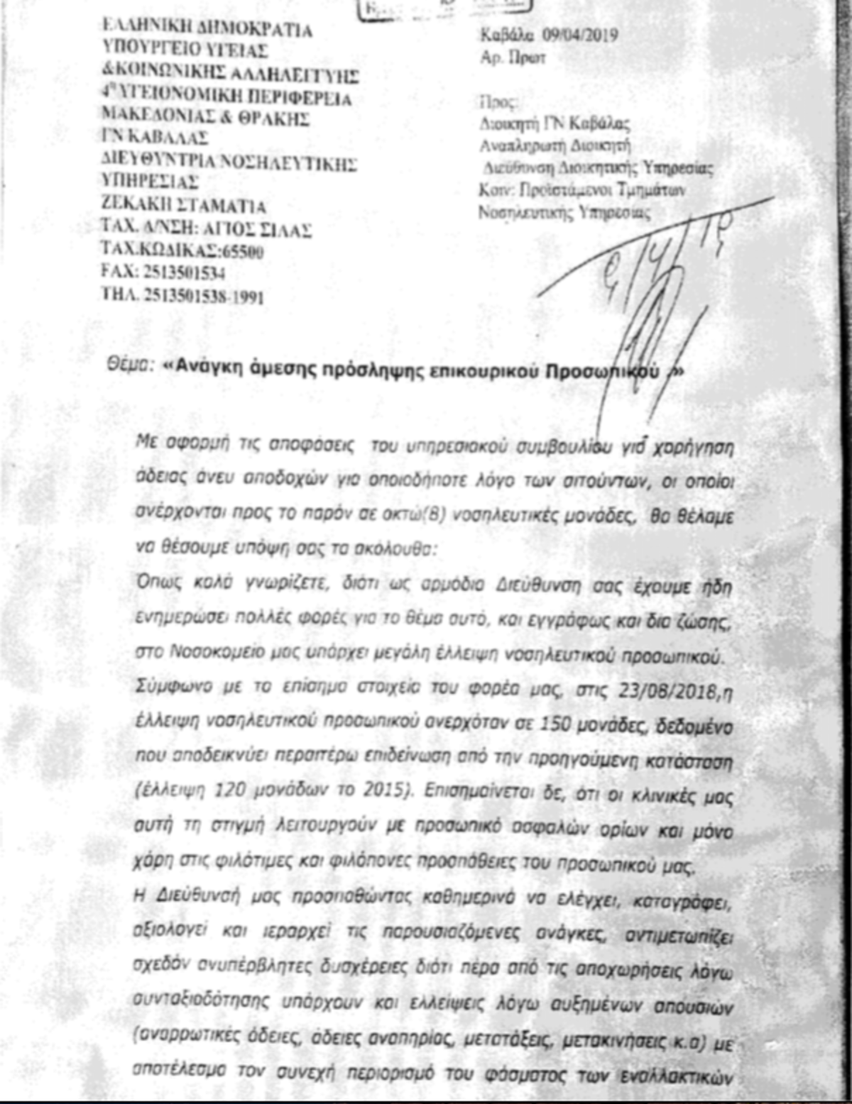 Δείτε το έγγραφο της προϊσταμένης νοσηλευτικής υπηρεσίας προς τη Διοίκηση του Νοσοκομείου Καβάλας: