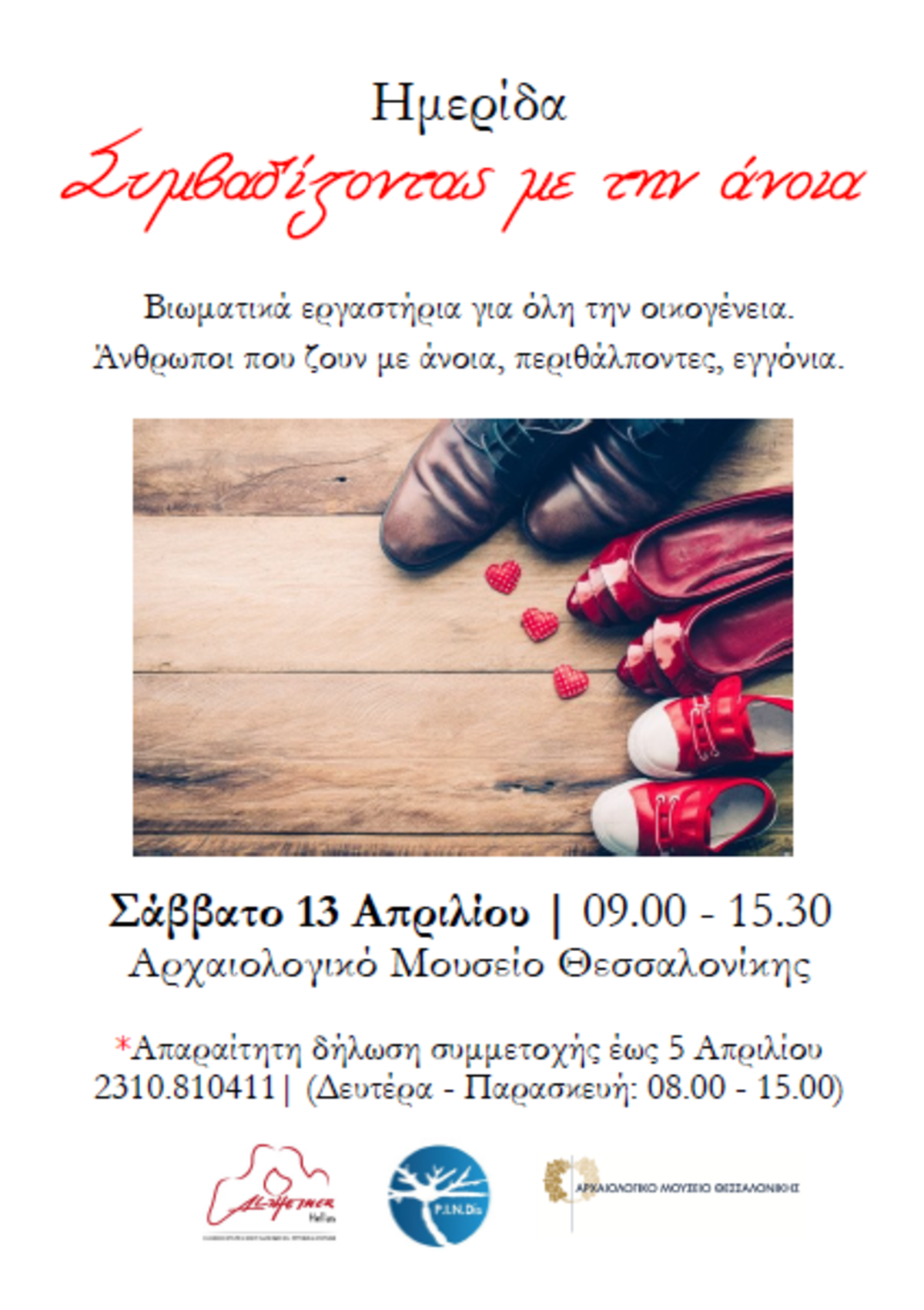 Την ημερίδα διοργανώνει το Πανελλήνιο Ινστιτούτο Νευροεκφυλιστικών Νοσημάτων σε συνεργασία με την Ελληνική Εταιρεία Νόσου Alzheimer και Συγγενών Διαταραχών. Τίτλος της είναι «Συμβαδίζοντας με την άνοια» και χώρος διεξαγωγής το Αρχαιολογικό Μουσείο Θεσσαλονίκης.