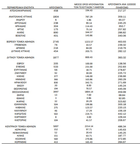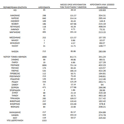 Από τα 35.580 κρούσματα, τα 15.713 εντοπίστηκαν στην Αττική, 3.997 στη Θεσσαλονίκη, 2.036 στη Θεσσαλία και 1.576 στην Κρήτη. Συνολικά 41 Περιφερειακές Ενότητες κατέγραψαν τριψήφιο αριθμό κρουσμάτων.