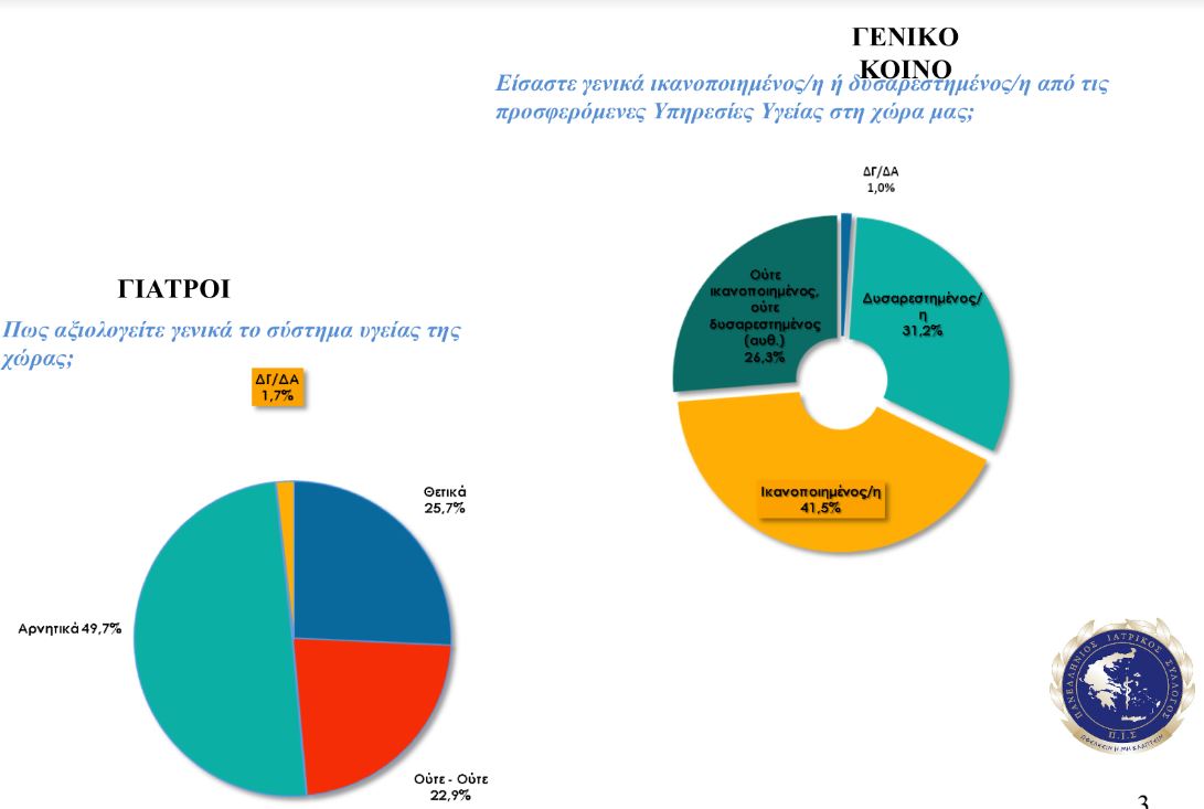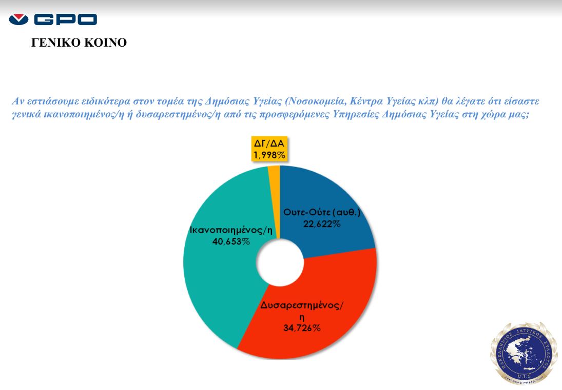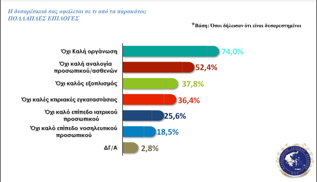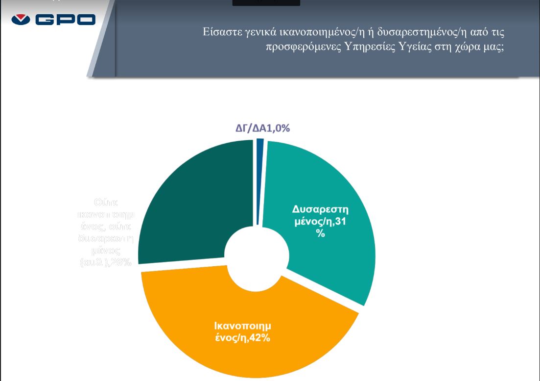 Ωστόσο, ένα άλλο ποσοστό που αγγίζει το 41,5% του γενικού πληθυσμού, δηλώνει ικανοποιημένο από τις προσφερόμενες υπηρεσίες Υγείας στη χώρα μας, ενώ το 74% είναι δυσαρεστημένο λόγω της ανοργανωσιάς που επικρατεί στα νοσοκομεία του ΕΣΥ.