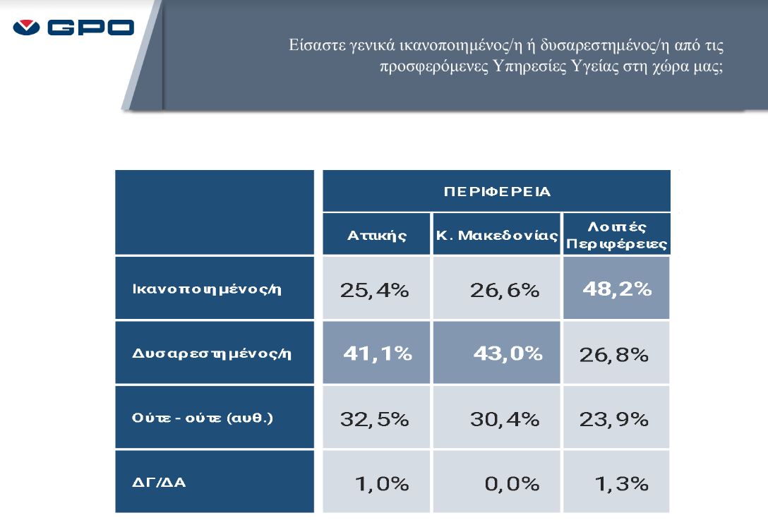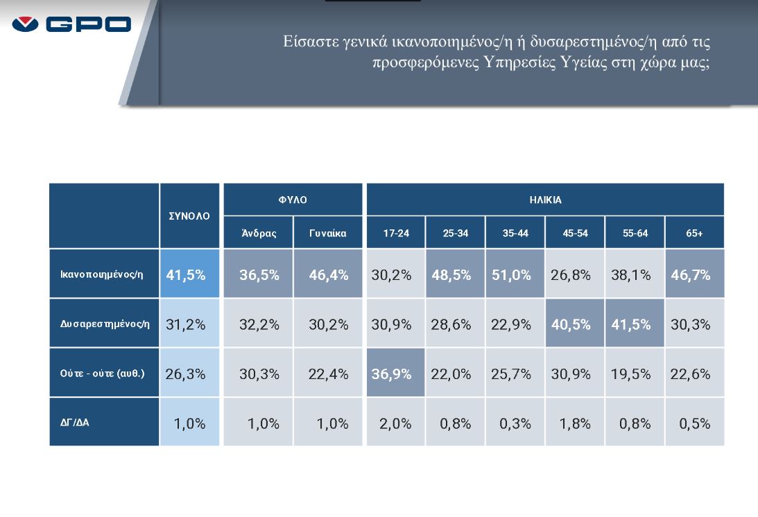 Την ίδια στιγμή, οι γυναίκες σε ποσοστό 46%, οι ηλικιακές ομάδες 25-44 ετών αλλά και οι άνω των 65 ετών είναι περισσότερο ικανοποιημένοι από τις υπηρεσίες Υγείας.