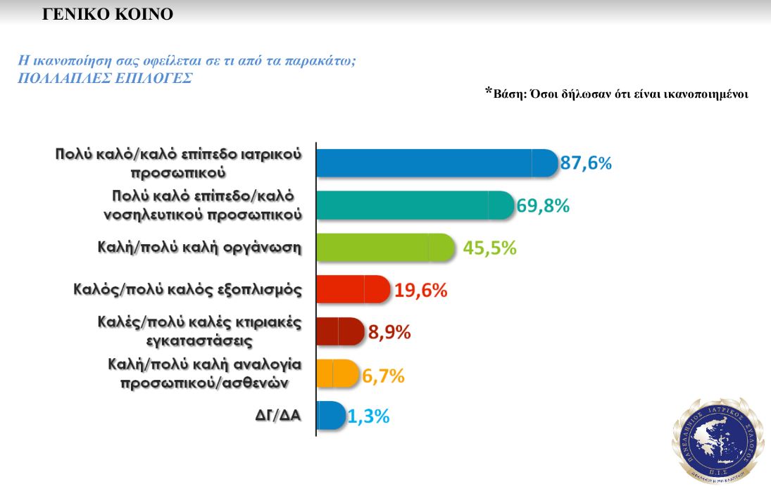 Στα αποτελέσματα της μελέτης, τα οποία έδωσε στη δημοσιότητα το προεδρείο του ΠΙΣ, συμπεριλαμβάνεται το στοιχείο πως οι πολίτες στο συντριπτικό ποσοστό του 87,6% δηλώνουν ικανοποιημένοι από το καλό επίπεδο υπηρεσιών που προσφέρουν οι γιατροί του ΕΣΥ.