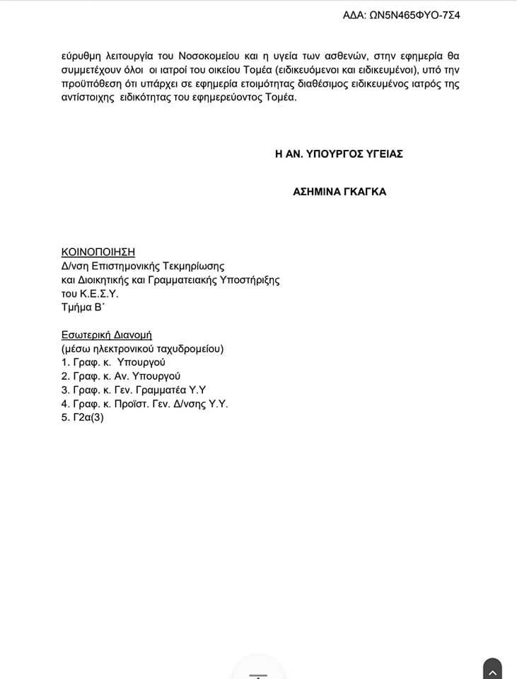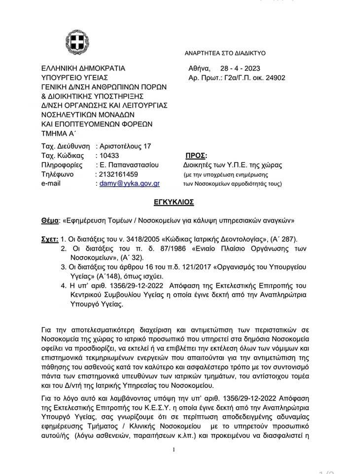 Για τον λόγο αυτό η κυβέρνηση και συγκεκριμένα η αν. υπουργός Υγείας, Μίνα Γκάγκα, με εγκύκλιό της στις 28/4, επιτρέπει όταν στο Νοσοκομείο ή στο Κέντρο Υγείας δεν υπάρχει γιατρός συγκεκριμένης ειδικότητας, η κάλυψη των εφημεριών να γίνεται από γιατρό άλλης ειδικότητας του ίδιου τομέα.