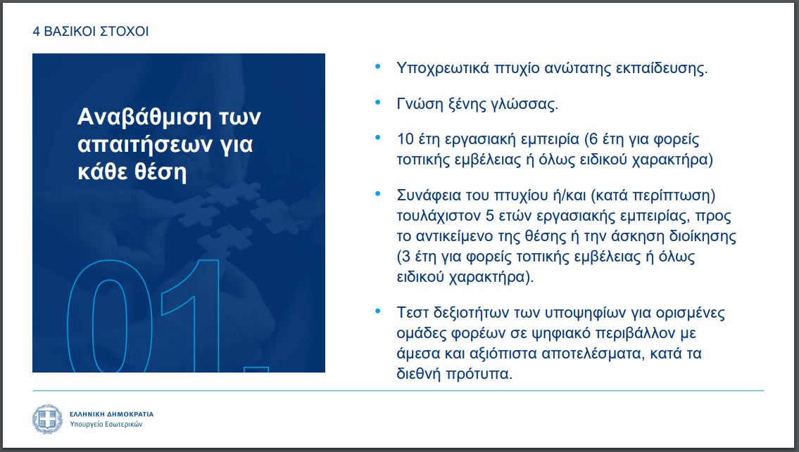 - Ορίζονται νέες απαιτήσεις και αυστηρά ελάχιστα προσόντα (πτυχίο ή/και κατά περίπτωση εργασιακή εμπειρία σε συνάφεια προς το αντικείμενο της προκηρυσσόμενης θέσης ή τη διοίκηση), εξασφαλίζοντας ότι όσοι επιλέγονται έχουν τα απαραίτητα προσόντα και ικανότητες για να αντεπεξέλθουν στα καθήκοντά τους.