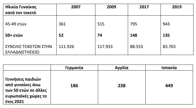 Ο παρακάτω πίνακας που προέρχεται από τα επίσημα στατιστικά στοιχεία της ΕΛΣΤΑΤ, «αποδεικνύει ότι ο αριθμός των παιδιών που γεννιούνται στην Ελλάδα από γυναίκες άνω των 50 ετών δεν μπορεί να παραβλεφθεί και να θεωρηθεί αμελητέος», αναφέρει η Εθνική Αρχή Υποβοηθούμενης Αναπαραγωγής.