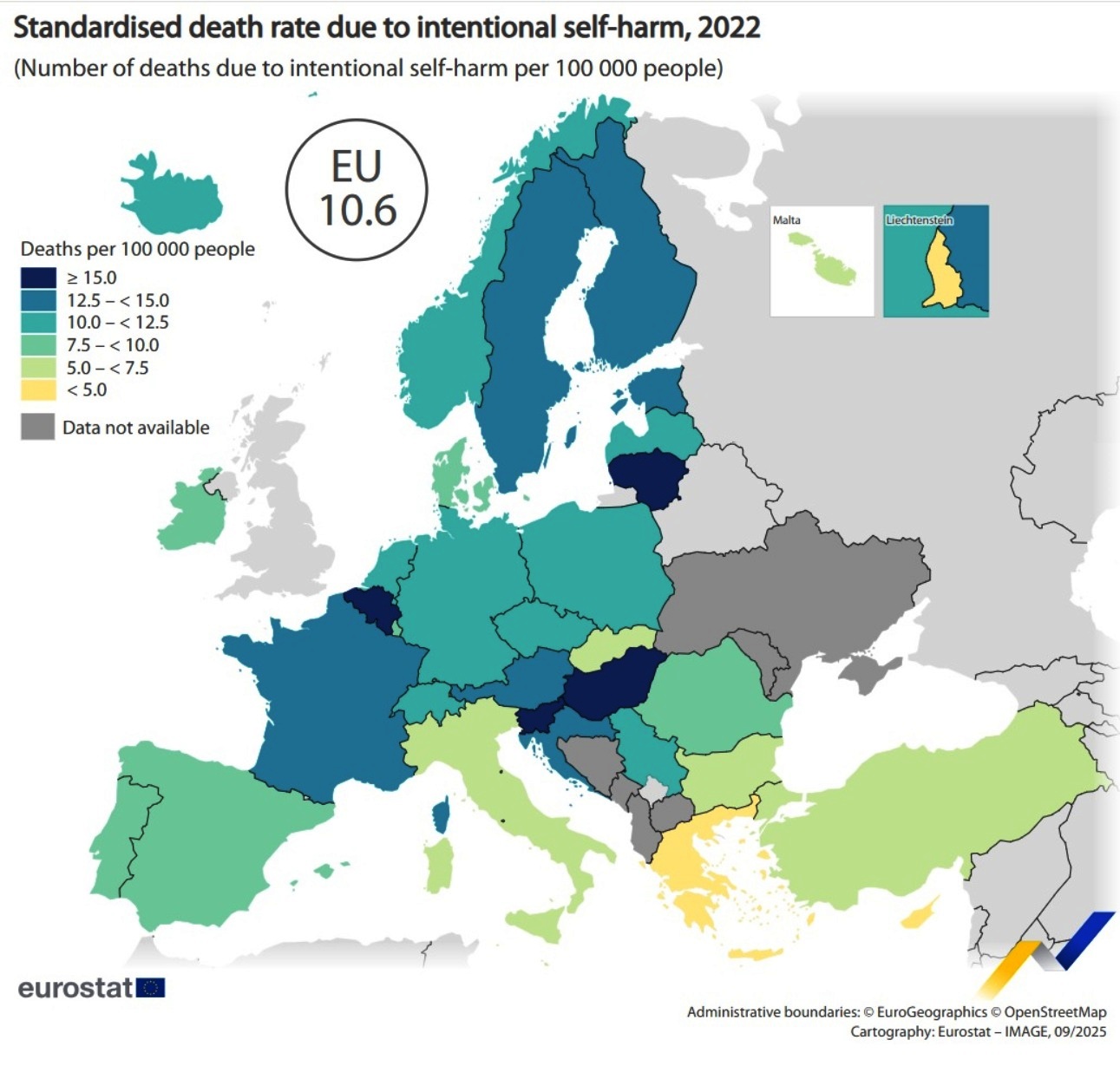 Σε όλες τις ηλικίας, το 2022 πέθαναν από αυτοκτονία 49.042 άνθρωποι. Αντιστοιχούν σε 10,6 θανάτους ανά 100.000 ευρωπαϊκού πληθυσμού.