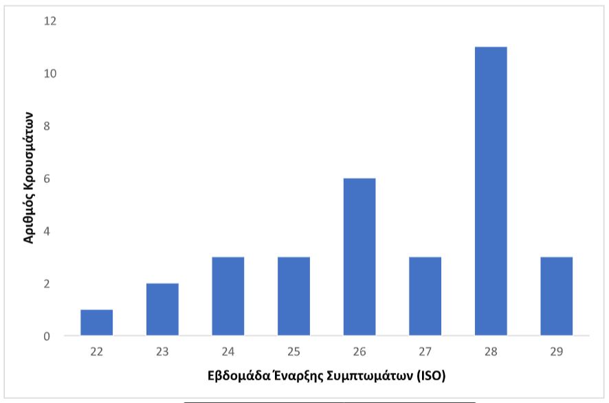 Η χρονική κατανομή των εργαστηριακά επιβεβαιωμένων κρουσμάτων ανά εβδομάδα έναρξης συμπτωμάτων (εβδομάδα κατά ISO) παρουσιάζεται στο Γράφημα 1.
