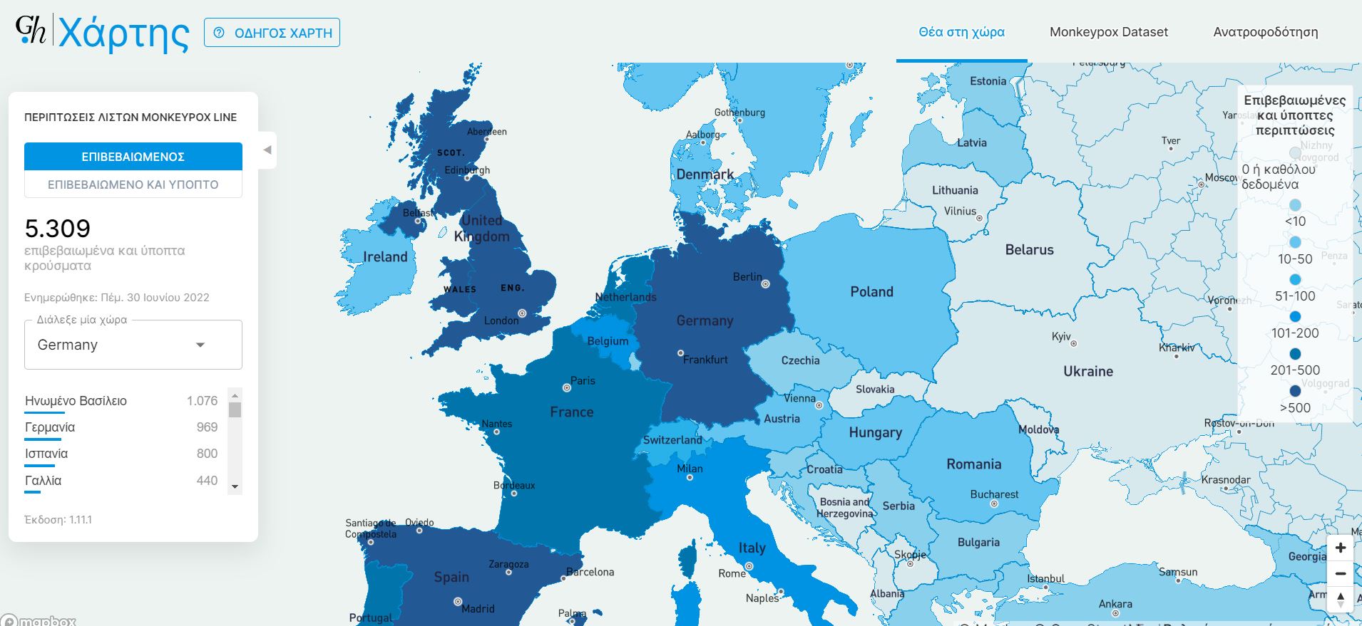 Σύμφωνα με τον ιστότοπο map.monkeypox.global.health που αποτυπώνει την διασπορά της νόσου σε πραγματικό χρόνο, από τις 7 Μαϊου 2022 οπότε και σημειώθηκε το πρώτο κρούσμα επί ευρωπαϊκού (βρετανικού) εδάφους και μέχρι χθες Πέμπτη (30/6) το βράδυ, ταυτοποιήθηκαν 5.309 κρούσματα σε όλο τον κόσμο, με τα 4.607 από αυτά να εντοπίζονται στην Ευρώπη.