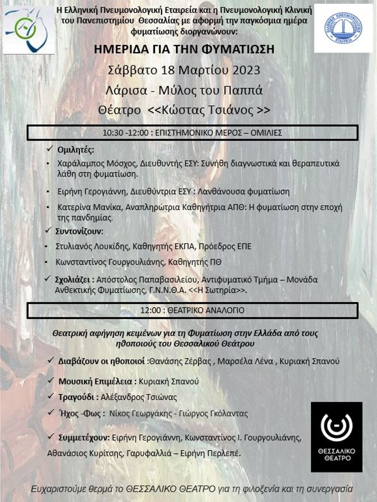 Η ημερίδα της ΕΠΕ και του Πανεπιστημίου Θεσσαλίας έχει τίτλο «Η ιστορία της φυματίωσης μέχρι και σήμερα». Θα διεξαχθεί το Σάββατο 18 Μαρτίου 2023 στη Λάρισα (Μύλος του Παππά), Θέατρο Κώστας Τσιάνος.