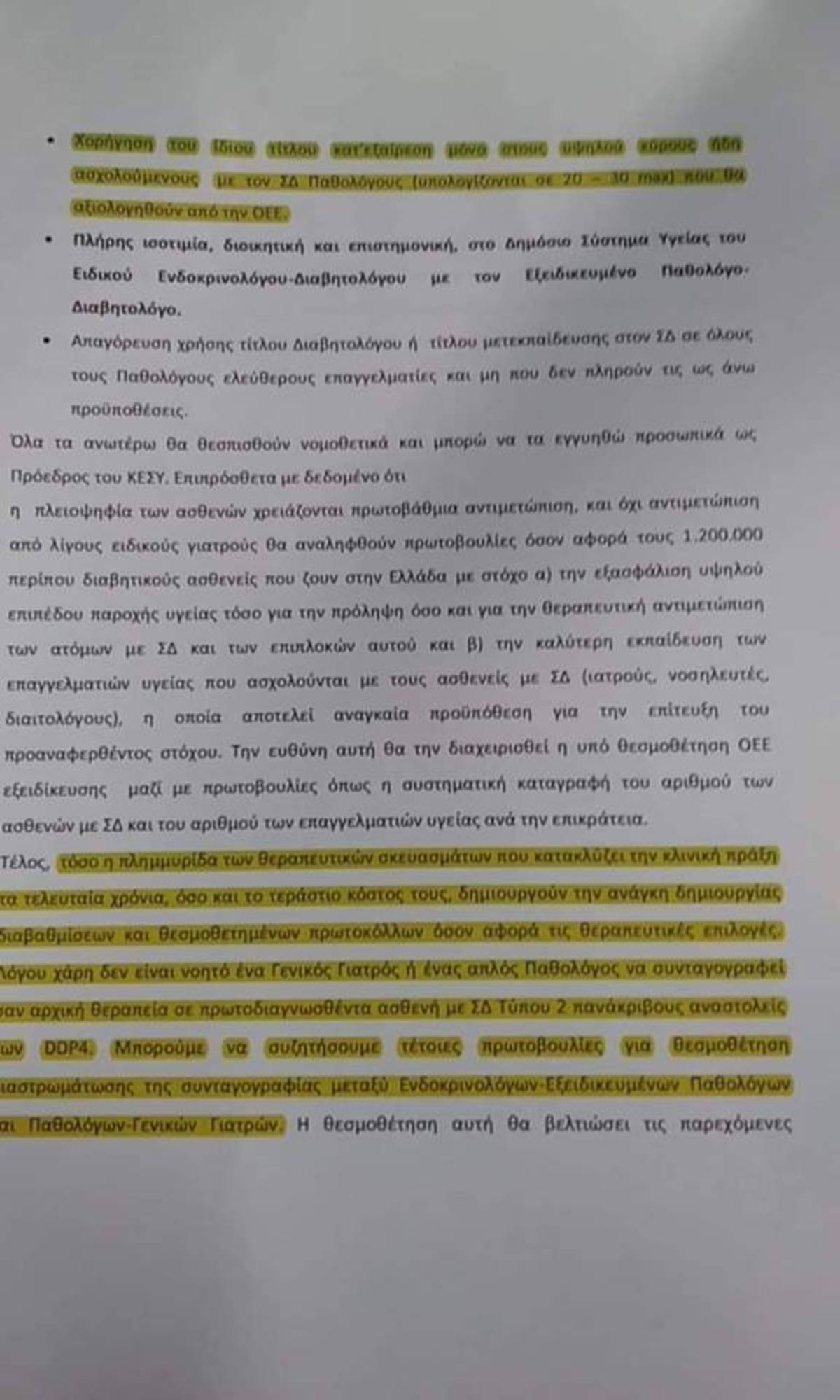 «Μπορούμε να συζητήσουμε πρωτοβουλίες για θεσμοθέτηση διαστρωμάτωσης της συνταγογραφίας μεταξύ ενδοκρινολόγων- εξειδικευμένων παθολόγων και παθολόγων – Γενικών Γιατρών… Η θεσμοθέτηση αυτή θα βελτιώσει τις παρεχόμενες υπηρεσίες στους ασθενείς και παράλληλα θα έχει οικονομικά οφέλη»…