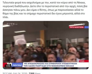 Με νέα ανάρτησή του στα social media, ο υπουργός Υγείας Άδωνις Γεωργιάδης επανέρχεται, για τελευταία φορά, όπως τονίζει, στα επεισόδια που σημειώθηκαν στο Νοσοκομείο Νίκαιας, μεταξύ του ίδιου και εργαζομένων. Ο υπουργός υγείας γράφει στην ανάρτησή του: «Τελευταία φορά που ασχολούμαι με την, κατά τον κύριο από τη Νίκαια, «ειρηνική διαδήλωση». Δείτε όλο το περιστατικό από την αρχή, πόση βία άσκησαν πάνω μου. Δεν είμαι ο θύτης, όπως με παρουσίασαν αλλά το θύμα της βίας και το επίμαχο περιστατικό δεν έγινε μπροστά, αλλά στο πλάι».