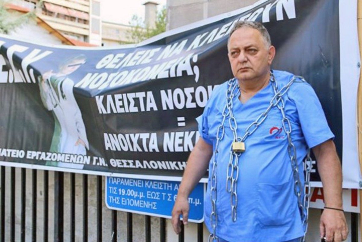 Αλυσοδεμένος στην πύλη εισόδου του Νοσοκομείου «‘Αγιος Δημήτριος» παρέμεινε για πολλές ώρες σήμερα το μεσημέρι ο πρόεδρος του Σωματείου εργαζομένων του ιδρύματος, Δημήτρης Μαυρόπουλος επιλέγοντας για πολλοστή φορά να κάνει γνωστές τις θέσεις του σωματείου με τον τρόπο αυτό…