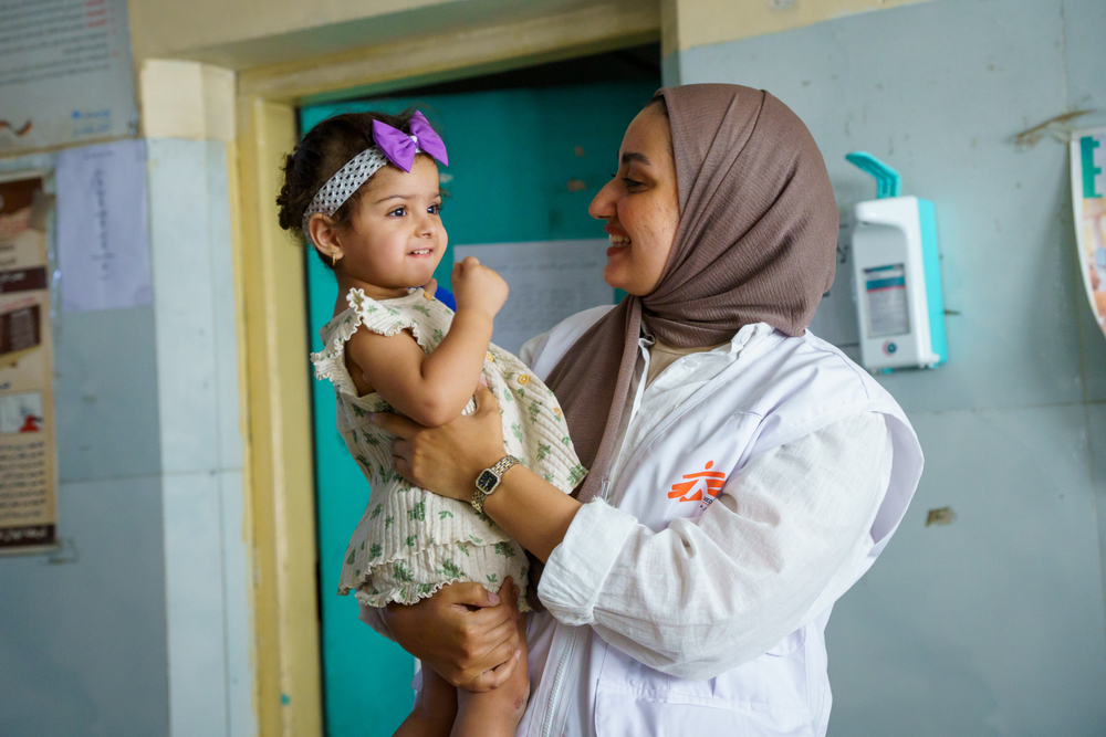 Ένα μέλος της ομάδας προαγωγής υγείας των Γιατρών Χωρίς Σύνορα κρατά στην αγκαλιά της τη Zara, ένα μικρό κορίτσι που λαμβάνει ιατρική φροντίδα στο κέντρο υγείας Al-Mahdi στην πόλη Sadr του Ιράκ. Η ομάδα προαγωγής υγείας των Γιατρών Χωρίς Σύνορα εργάζεται για την ευαισθητοποίηση και την παροχή διαγνωστικών εξετάσεων για τη φυματίωση στις οικογένειες της κοινότητας. © Deniz Fahmi/MSF