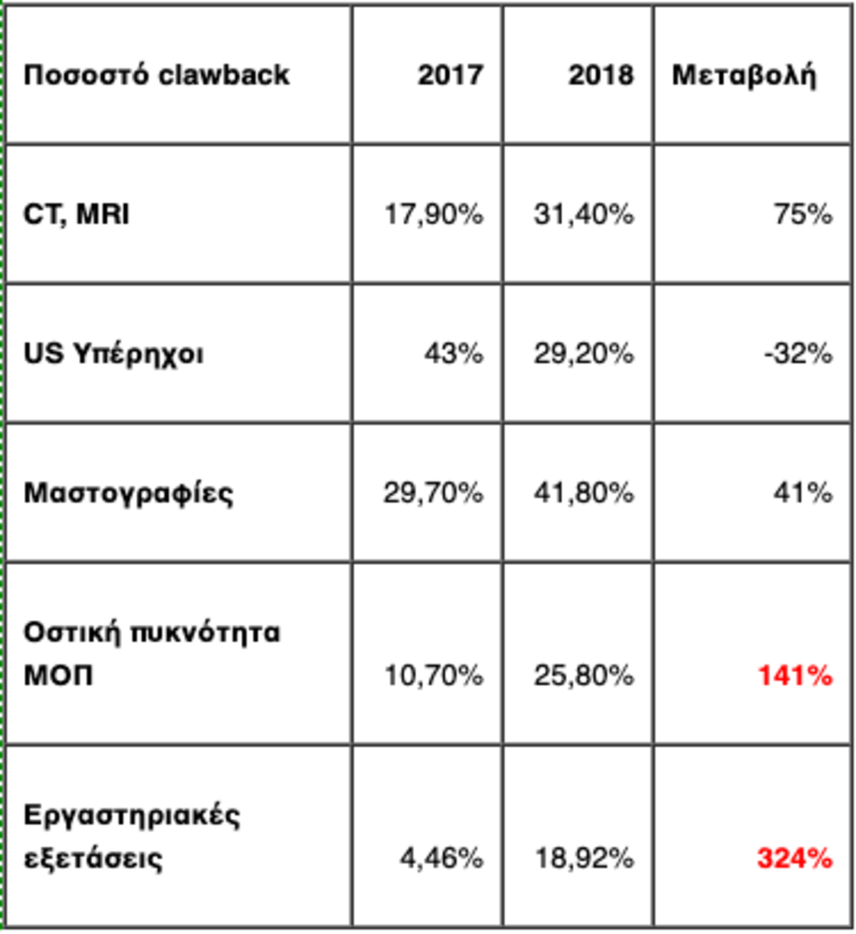 - Και ενώ το συνολικό clawback της διετίας 2016-17 ήταν 104 εκ για τις διαγνωστικές εξετάσεις, η πρόβλεψη μόνο για το 2018 αγγίζει τα 100 εκ !!! που φορτώθηκαν στις πλάτες των ανύποπτων Ελλήνων επιστημόνων, θυμάτων των φαντασμαγορικών υπερπλεονασμάτων και των παχιών αγελάδων.