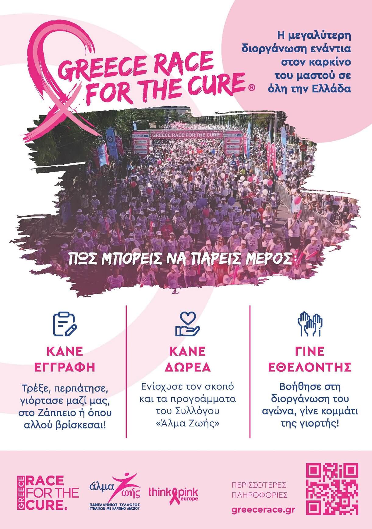 Το Greece Race for the Cure® πραγματοποιείται από τον Πανελλήνιο Σύλλογο Γυναικών με Καρκίνο Μαστού «Άλμα Ζωής» σε συνδιοργάνωση με τον Οργανισμό Πολιτισμού, Αθλητισμού και Νεολαίας του Δήμου Αθηναίων (ΟΠΑΝΔΑ), με την έγκριση της οργάνωσης Think Pink Europe® και είναι η δεύτερη μεγαλύτερη διοργάνωση Race for the Cure® παγκοσμίως, ευαισθητοποιώντας χιλιάδες κόσμου για τον καρκίνο του μαστού κάθε χρόνο.