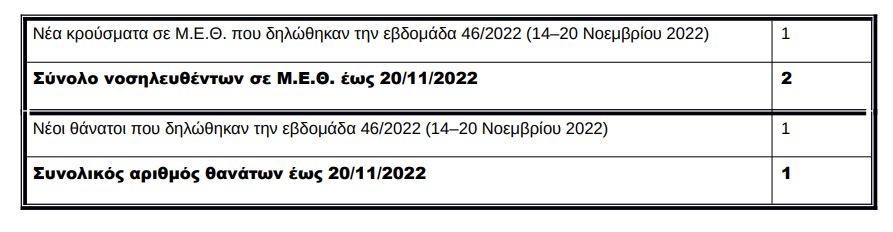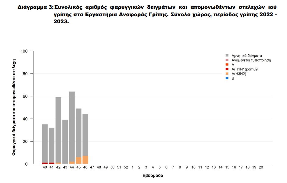 Σύμφωνα με τον ΕΟΔΥ, από τις 3 Οκτωβρίου έως και σήμερα έχουν εξεταστεί στα Κέντρα Αναφοράς Γρίπης όλης της χώρας 322 «ύποπτα» κλινικά δείγματα από νοσοκομεία και ιδιώτες γιατρούς. Τα 18 (5,59%) βγήκαν θετικά στους ιούς, με υπότυπο Α (Η1Ν1) pdm09 και Α (Η3Ν2).