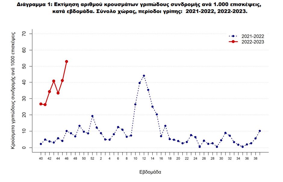 Σύμφωνα με την έκθεση του ΕΟΔΥ, την εβδομάδα 14 έως 20 Νοεμβρίου, καταγράφηκε, επίσης, και περαιτέρω αύξηση κατά 29% στις επισκέψεις σε γιατρούς ατόμων με «γριπώδη συνδρομή». Θετικά στον ιό βρέθηκαν τα 18 από τα 322 δείγματα που έχουν εξεταστεί.