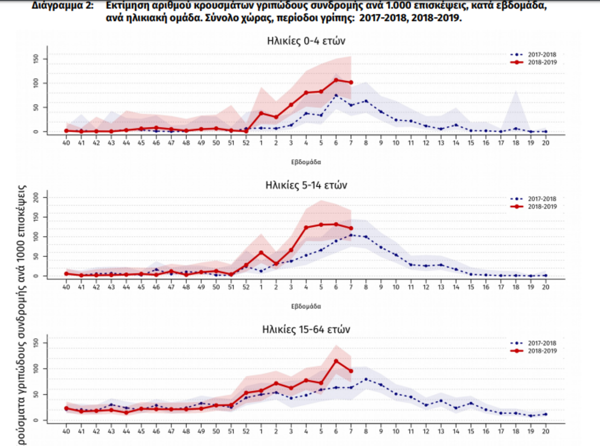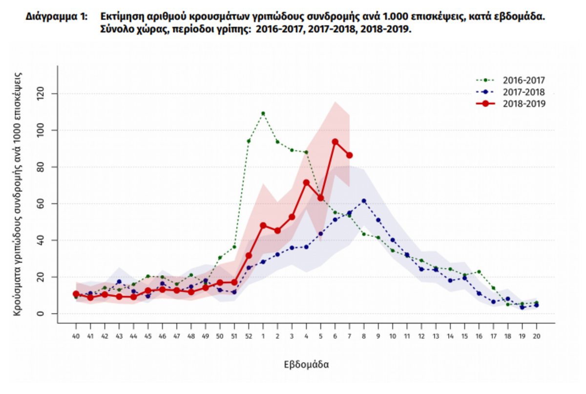 Εξ αυτών των κρουσμάτων εμβολιασμένα ήταν τα 46 (15%). Το ίδιο χρονικό διάστημα καταγράφηκαν συνολικά 91 θάνατοι από εργαστηριακά επιβεβαιωμένη γρίπη. Οι 81 θάνατοι αφορούσαν σε ασθενείς που νοσηλεύτηκαν σε Μ.Ε.Θ και 10 σε ασθενείς χωρίς νοσηλεία σε Μ.Ε.Θ. Με βάση τα ανωτέρω, η δραστηριότητα της γρίπης στην Ελλάδα παραμένει αυξημένη. Επικρατών υπότυπος είναι ο Α(Η1Ν1)pdm09. Τονίζεται η σημασία του αντιγριπικού εμβολιασμού ως ο καλύτερος τρόπος προφύλαξης από τη γρίπη.