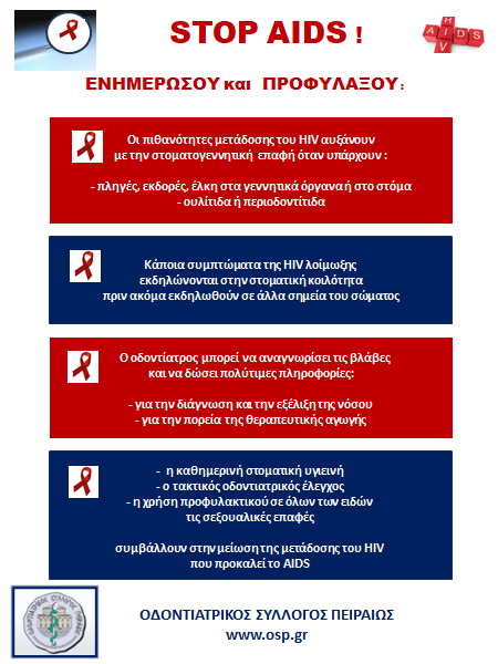 Ως Οδοντιατρικός Σύλλογος Πειραιώς τονίζουμε ότι η πρόληψη είναι αυτή που θα κλείσει την πόρτα στο ιό HIV! Καθώς η μετάδοση του ιού στο μεγαλύτερο ποσοστό είναι μέσω της σεξουαλικής επαφής, η χρήση του προφυλακτικού είναι απαραίτητη και κατά την στοματογεννητική επαφή.
