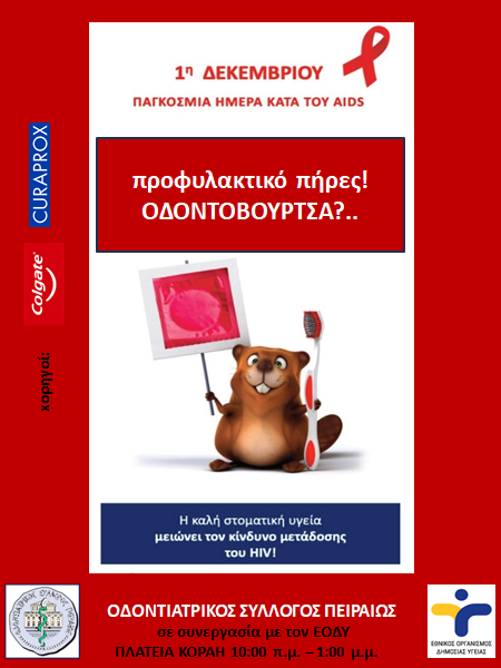 Ο Οδοντιατρικός Σύλλογος Πειραιώς σας προσκαλεί σε ενημερωτική δράση την Παρασκευή 1η Δεκεμβρίου Παγκόσμια ημέρα κατά του ΑΙDS από 10:00 π.μ. έως 13:00 μ.μ. , στην πλατεία Κοραή στον Πειραιά.