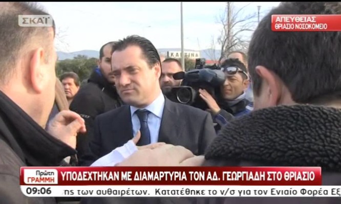 Μόλις τον είδαν τα πνεύματα οξύνθηκαν. Μια ομάδα τον περικύκλωσε και άρχισαν να του επιρρίπτουν ευθύνες τόσο για την απογύμωνση του ΕΣΥ από νοσηλευτικό προσωπικό αλλά και την γενικότερη πολιτική κατάσταση στην οποία έχει περιέλθει η χώρα λόγω μνημονίου.«Κάτω τα χέρια από τα νοσοκομεία». του φώναζαν έντονα οι εργαζόμενοι αλλά ο Άδωνις αυτή την φορά ήταν ιδιαίτερα ψύχραιμος: